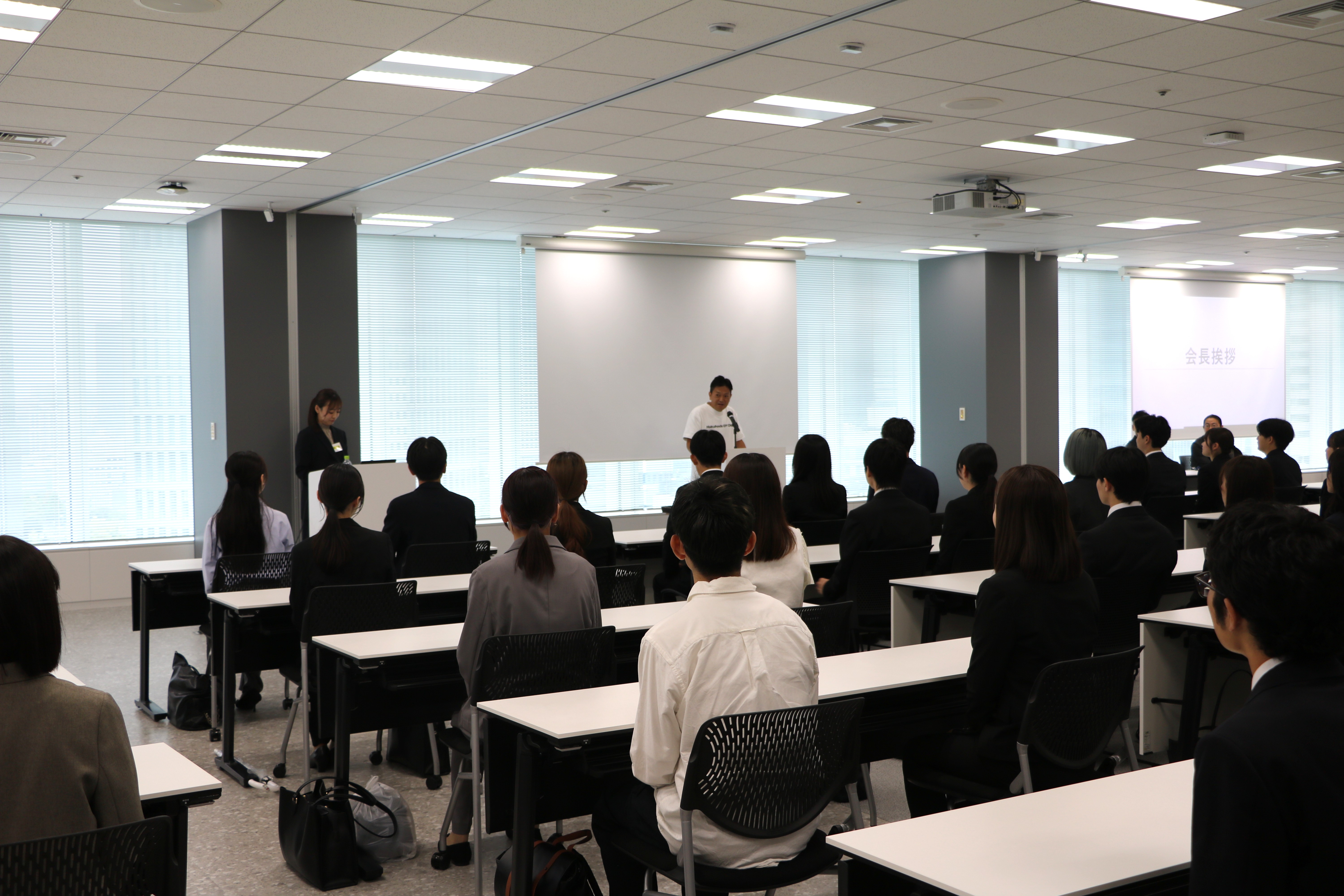 はじめに代表取締役会長の田中雄三が登壇し、数ある企業の中から当社を選び、内定を承諾してくれた皆さんに向けて、