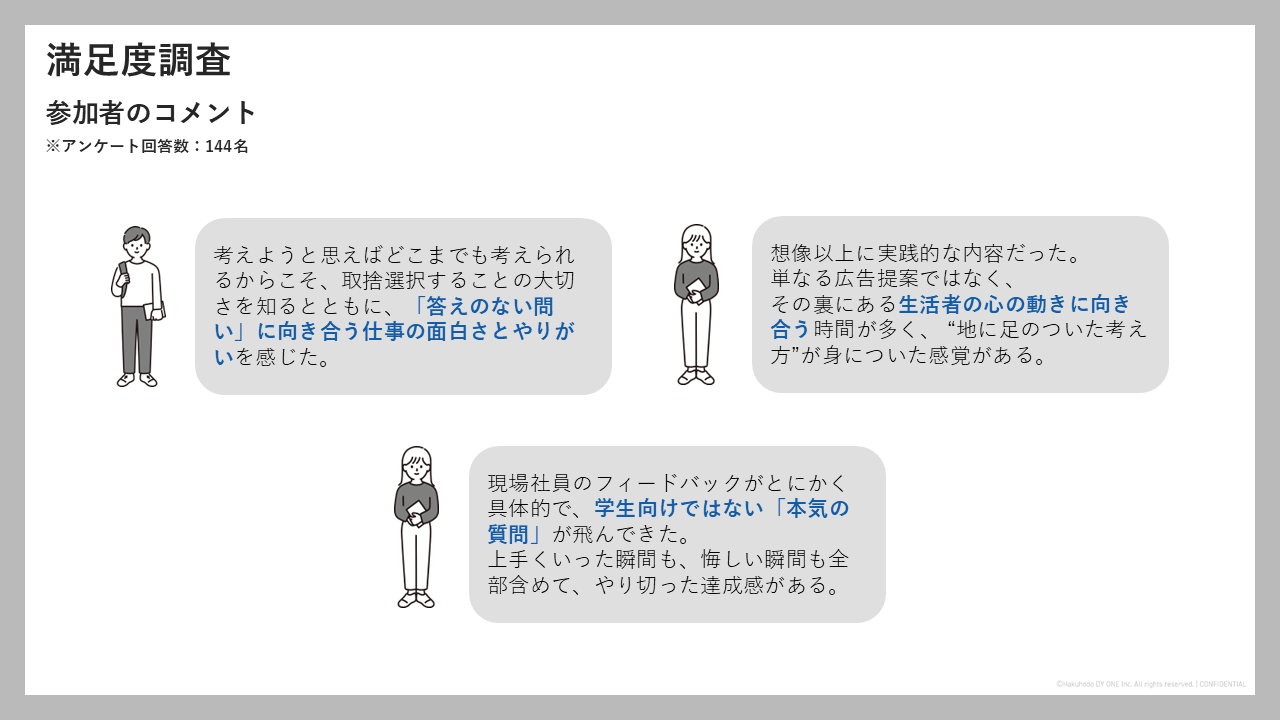 優勝チームが決まる最終発表では、審査員を前に緊張感のある中でプレゼンテーションが行われました。審査員からはプロ目線での質問・フィードバックがあり、手に汗握る時間でしたが、Hakuhodo DY ONEの仕事の難しさと面白さの両方を体験してもらえたのではないかと思います。