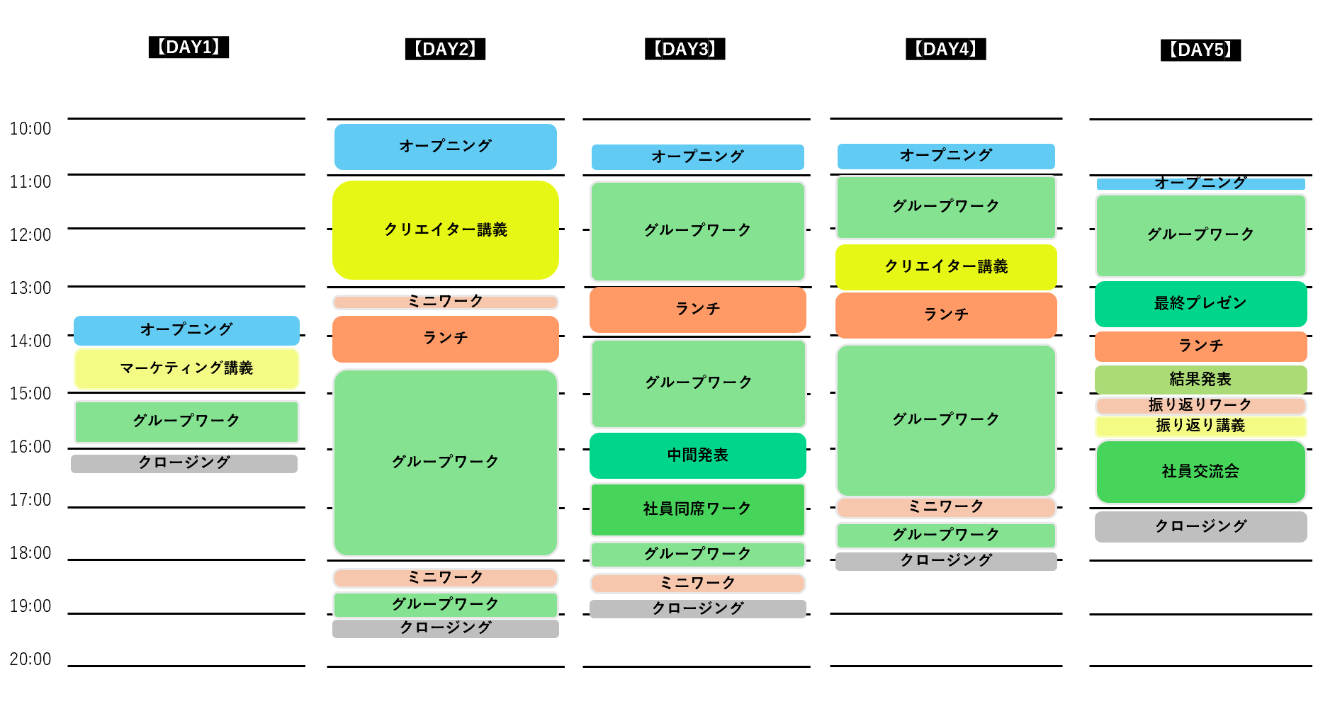 業界最前線に立つトップクリエイターによる講義や、現場で活躍するエース社員からのフィードバックを通じて、よりリアルな視点でのクリエイティブワークを体験できる5日間となっています。
